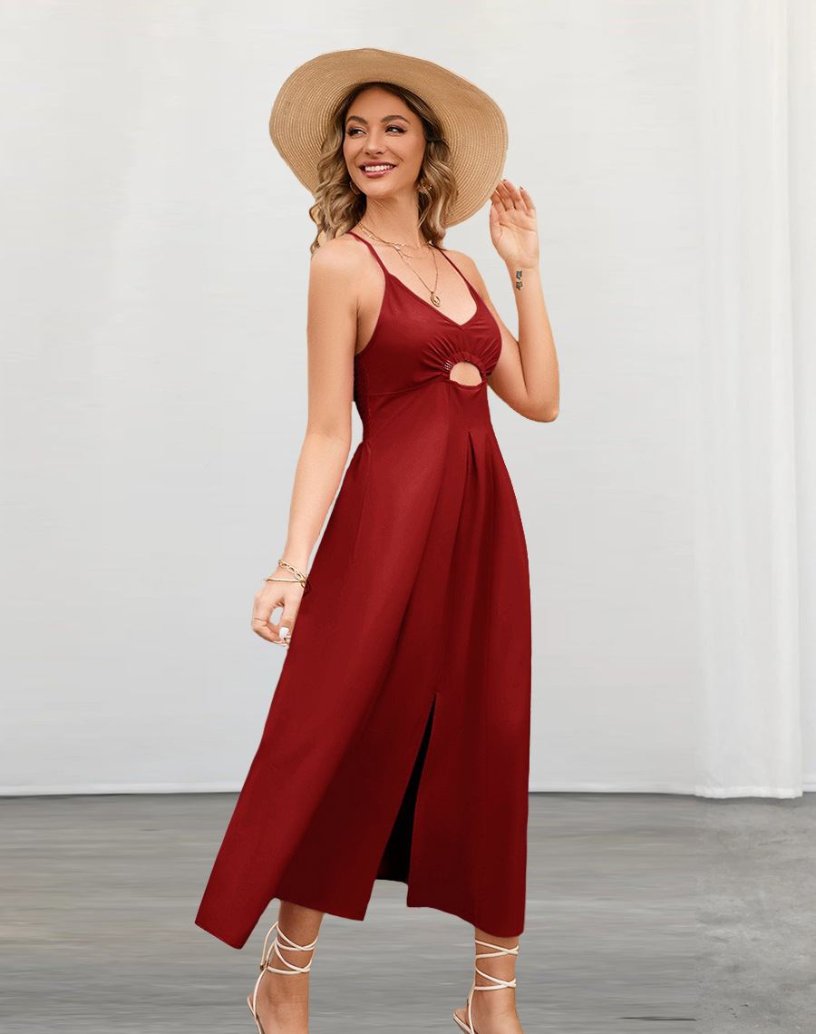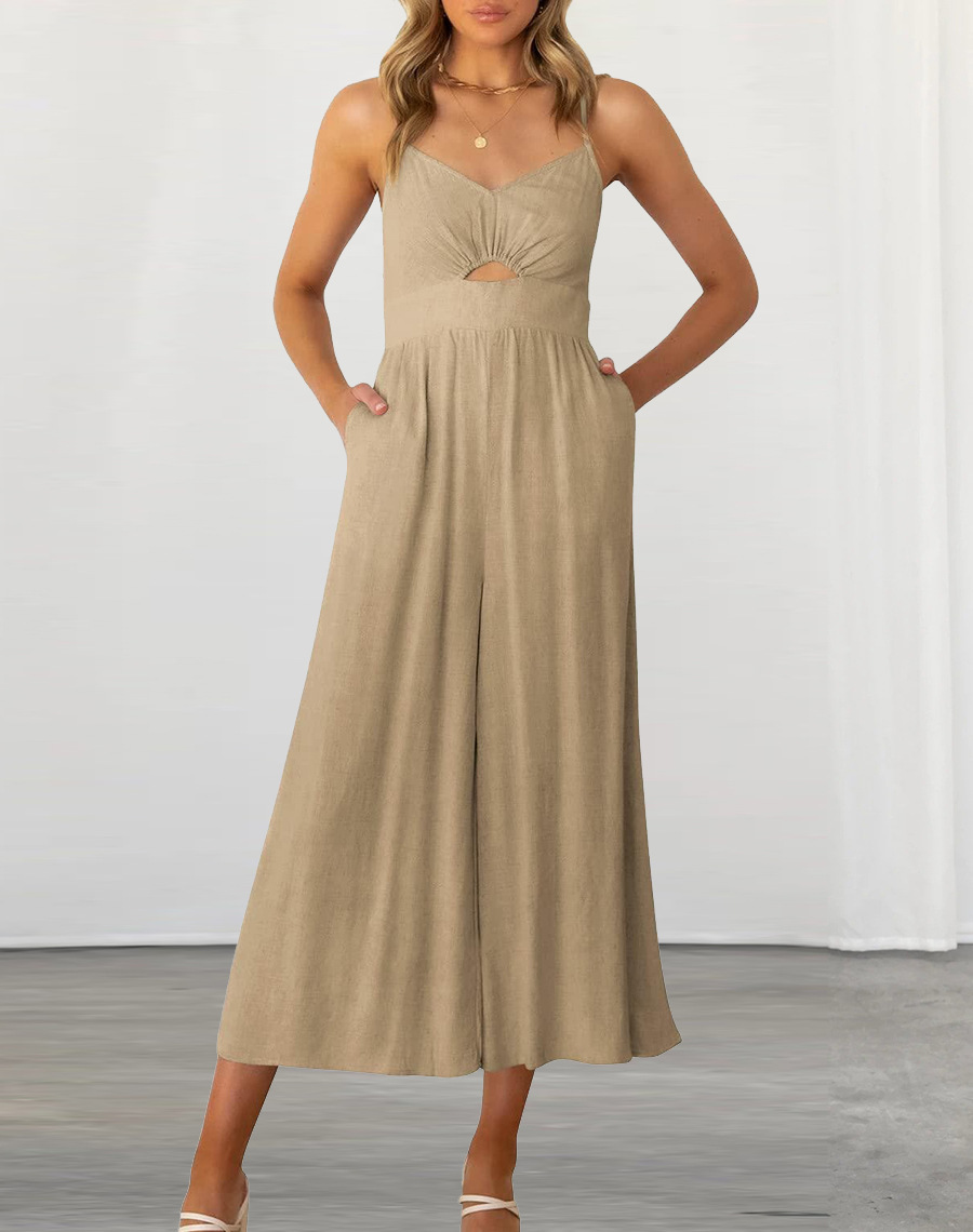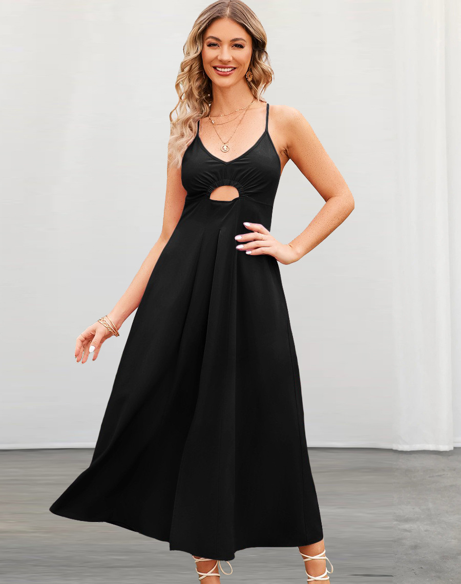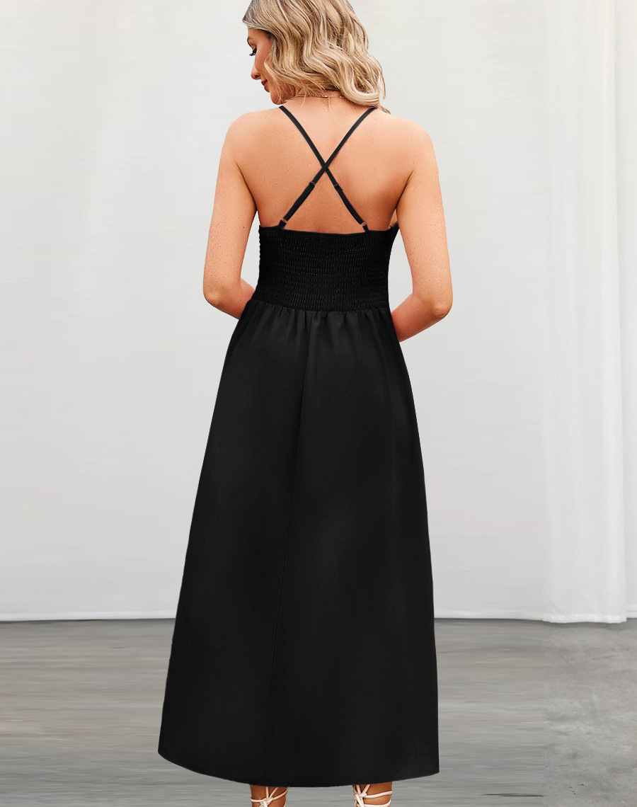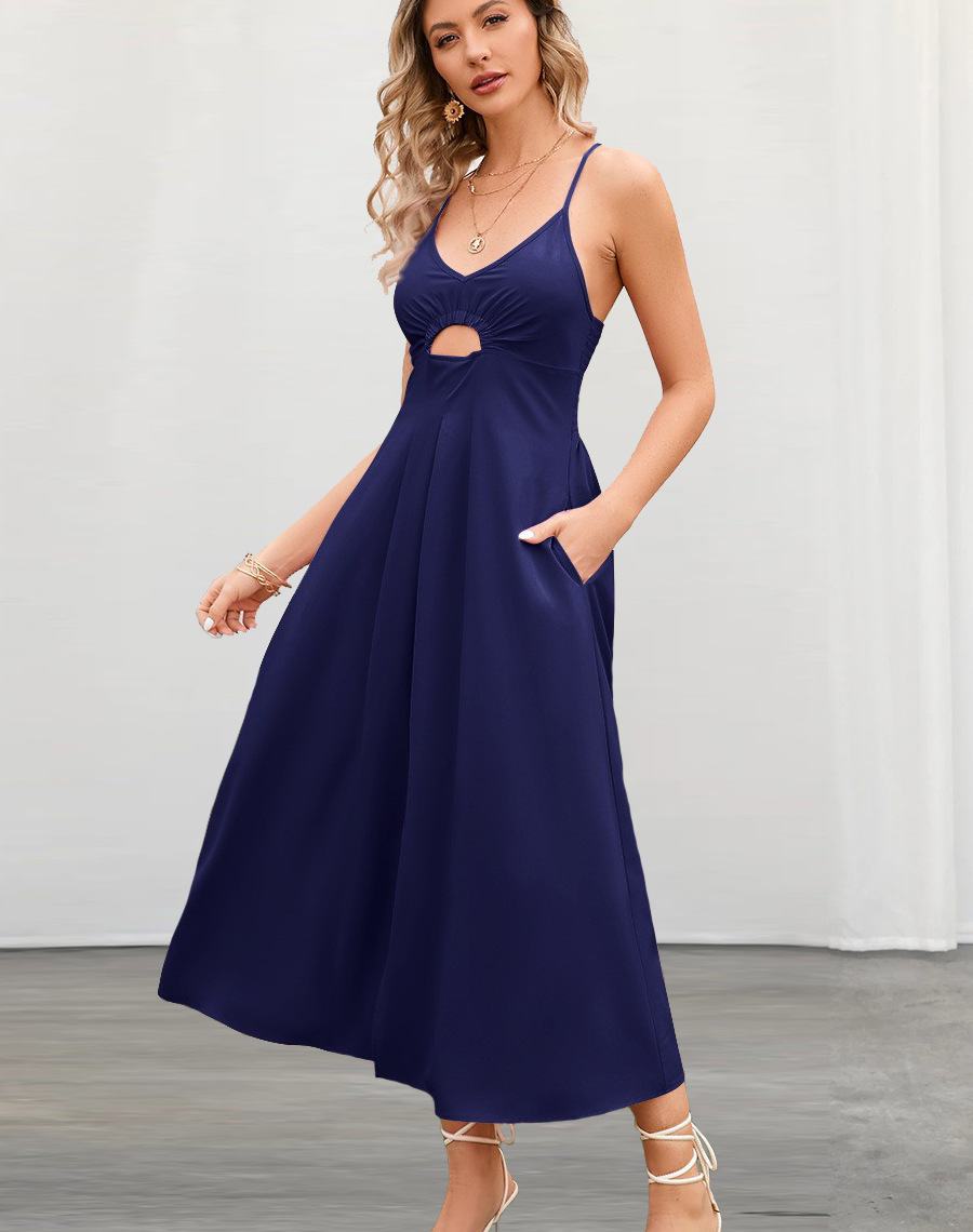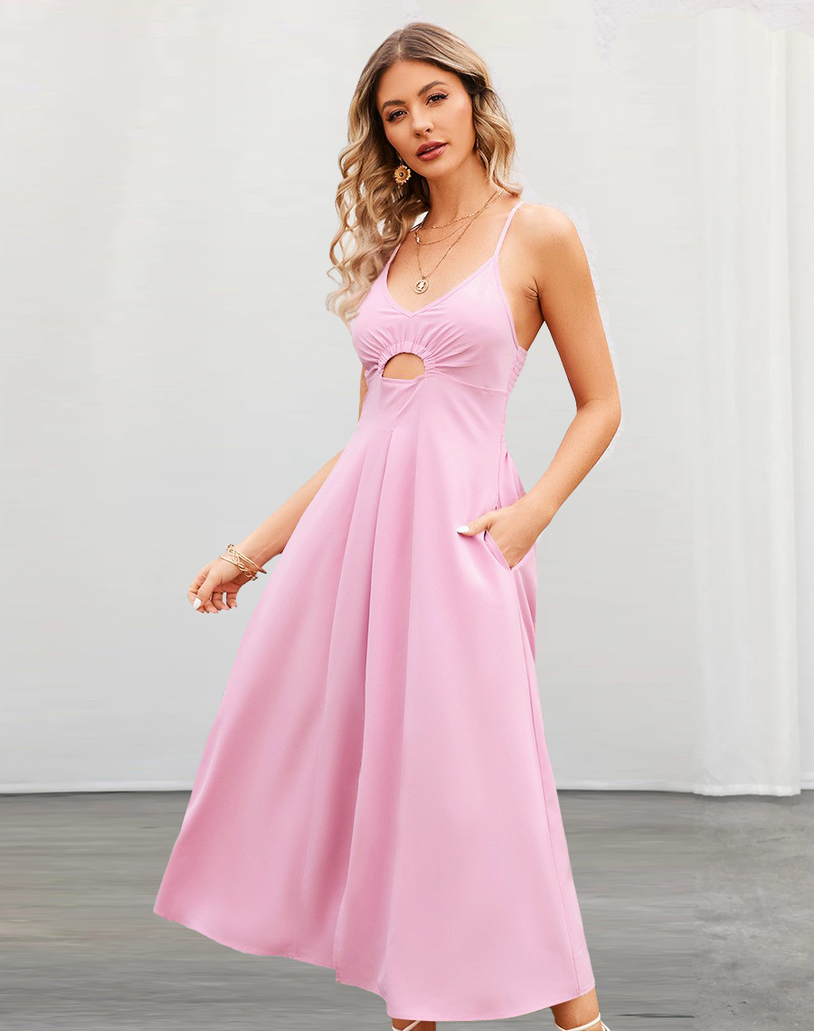 Style: A-line dress with V-neck, sleeveless, mid-waist, and pocket